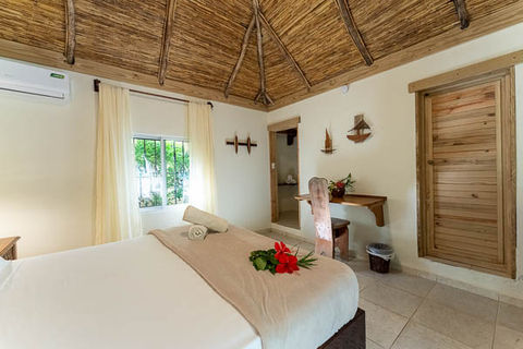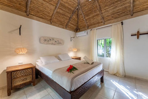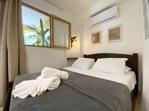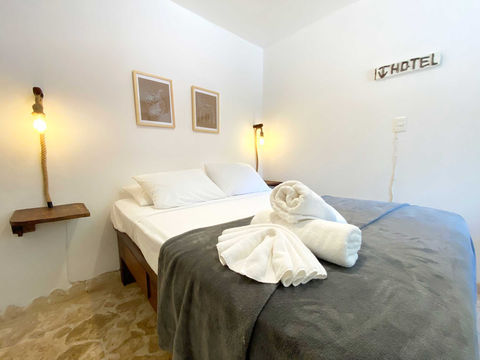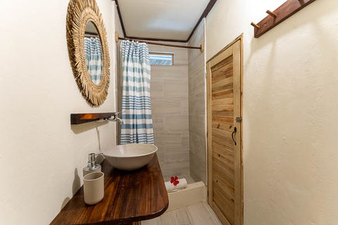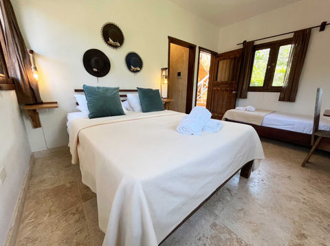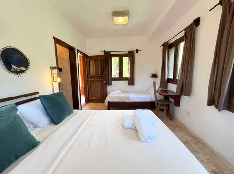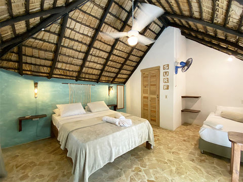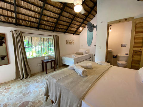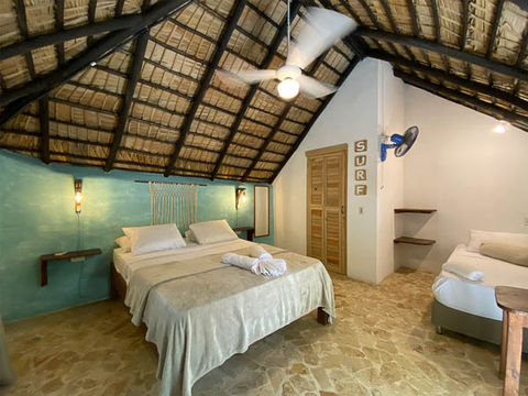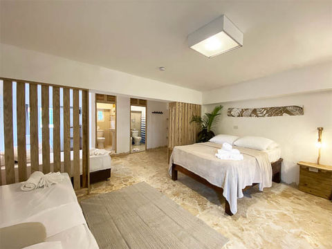 We offer 17 private bedrooms, each with its own bathroom. Most rooms have A/C, others are fan-cooled, and several are spacious enough to accommodate up to 4 guests. All rooms are styled with a fresh ocean vibe, and we provide sheets, bedding, and towels. A delicious breakfast served between 8am and 11am, daily housekeeping and free WiFi are included in your stay.​